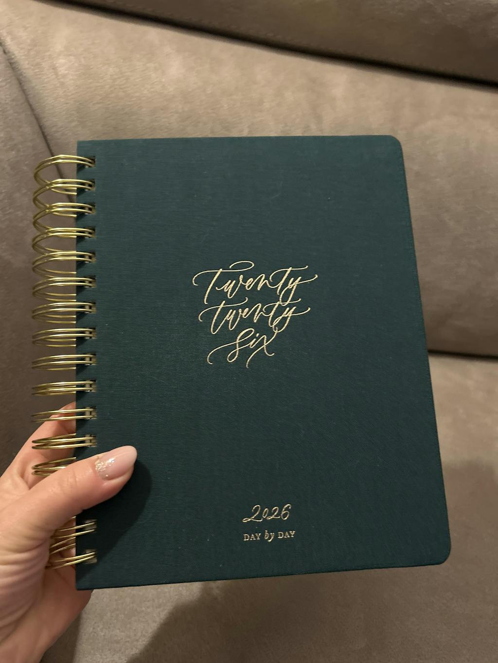 A 2026 daily planner with a deep green cover and gold foil detailing. The design is simple and elegant, styled on a clean background with soft natural lighting.