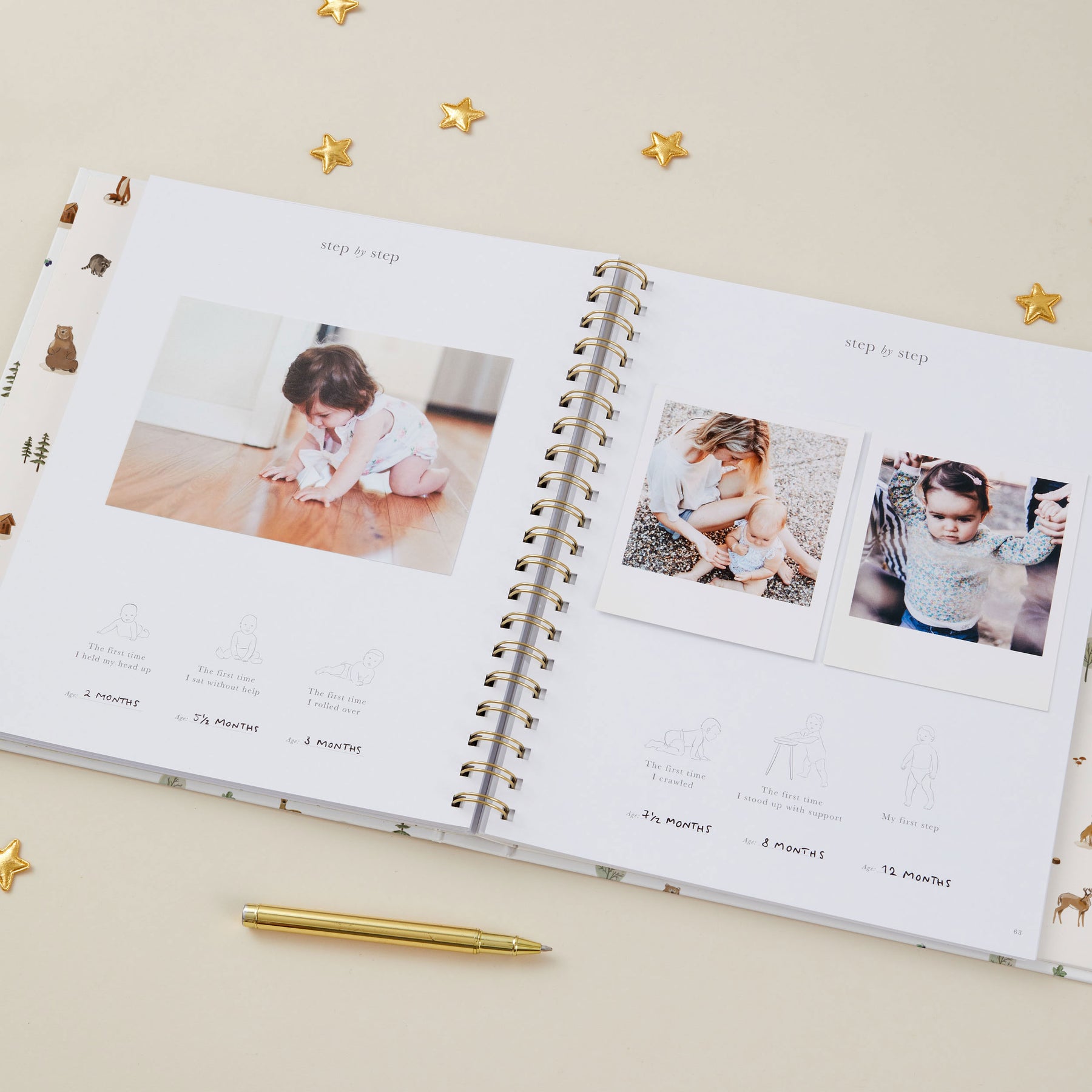 Open photo album with baby milestone photos on a beige background